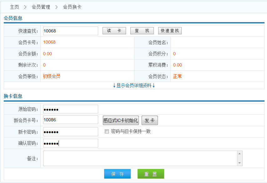 2.本操作用于會員更換新卡操作,換卡支付費用不在卡內扣款,要收取現(xiàn)金.