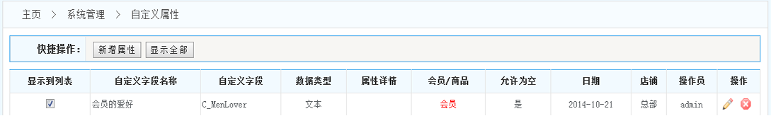 自定義屬性設(shè)置:清除全部數(shù)據(jù)、還原測試:給會員新增自定義屬性字段,可在會員列表體現(xiàn).點(diǎn)擊【顯示全部】自定義字段全部顯示在會員列表中