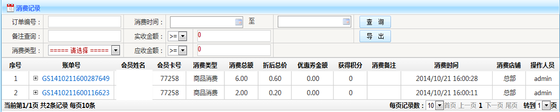 1.查詢:可以根據(jù)消費單號 時間段 消費類型等條件查詢